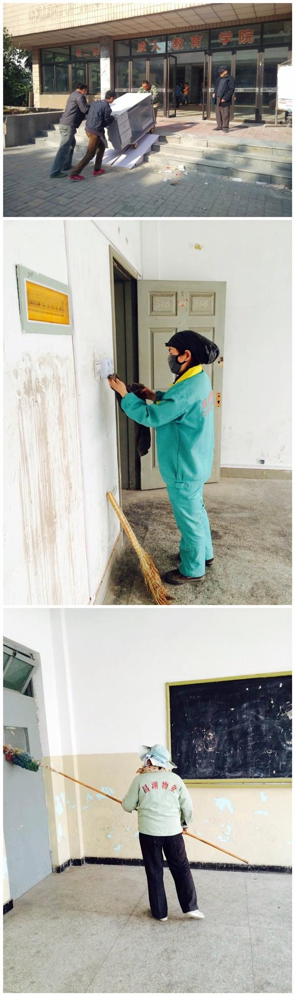 因文昌校区教四楼整体改造,按照学院规划2016年3月28日开始,原文昌校区教四楼信电学院统一搬迁至文昌教二楼。为了保证搬迁工作的顺利进行,昌湖物业文昌管理组加班加点,利用周末休息时间,提前做好了各项充分的准备工作。由于教2楼长期空置,楼外围残留下大量的渣土,楼内灰尘布满了地面、墙面等各个角落,要想在最短的时间内全部清理干净,达到学校及学院的物业要求,繁重的工作任务是可想而知的。但是,物业员工全体上下克服了困难,为抓紧时间提高效率,管理组从其他楼宇抽调保洁及安保人员,分别成立了保洁应急、秩序维护小组,大家合理分工,各司其职。